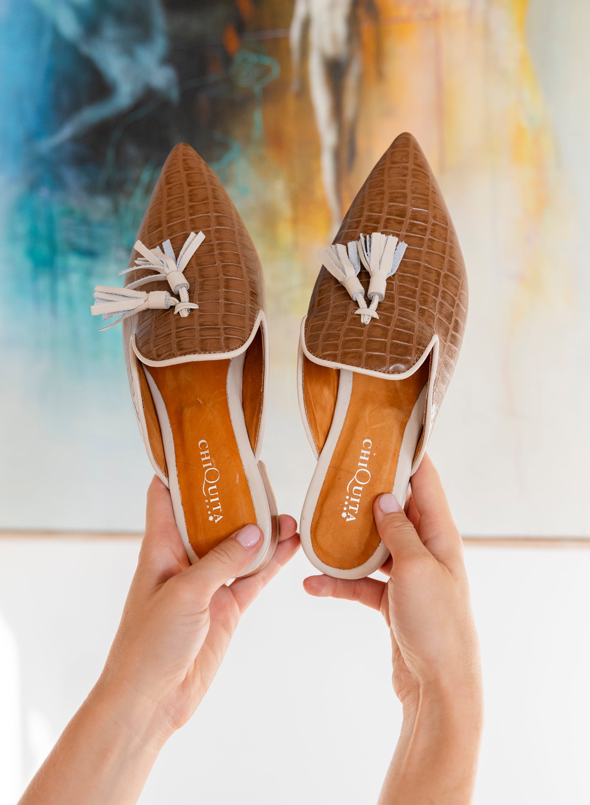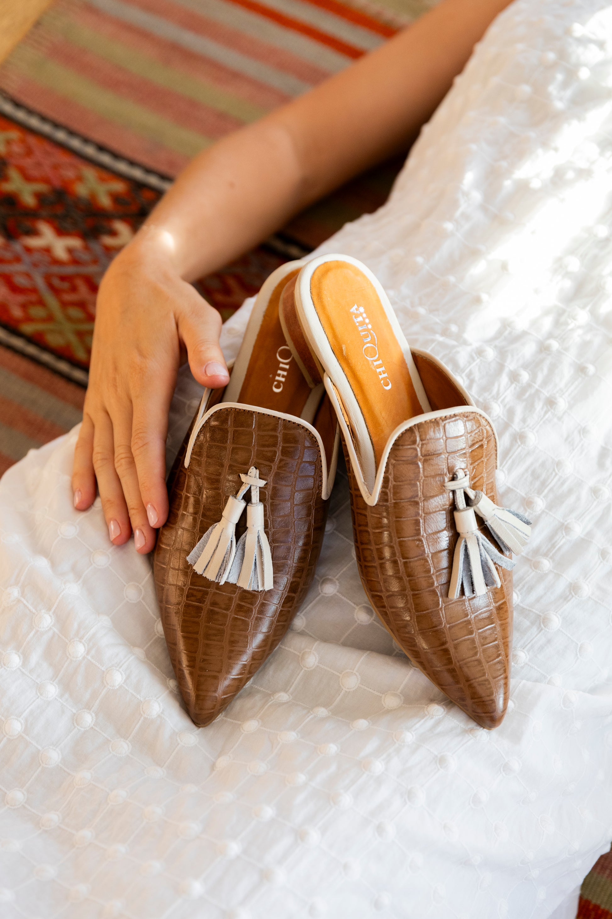 Desde un look casual a uno más formal, nuestras Babuchas Capri son perfectas para ser la estrella de tu outfit. Son muy cómodas y súper estilosas. Hechas con cuero en color caramel texturizado con un pompón color crema. Let’s walk the world!