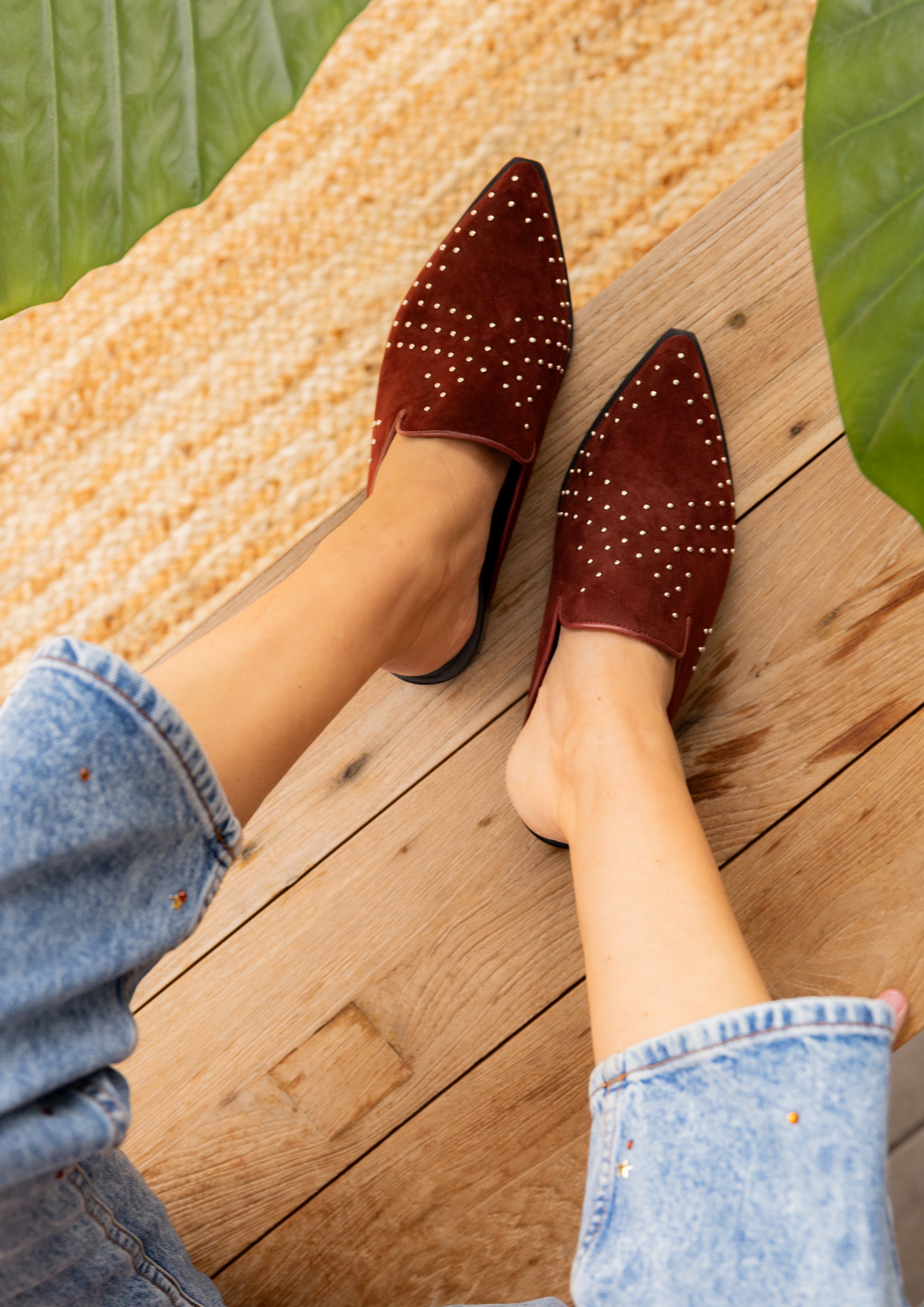 Las babuchas Hollywood están hechas para acompañarte a brillar. Sus tachas y diseño quedan perfectos para outfits de día o de noche. Hechas con cuero ante en color burdeo. Let’s walk the world!